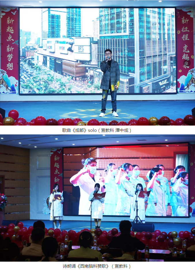 今年年会由宣教科杨洪璐和医务科李鹏主持,分为三部分,先是邢院长发言,随后是对我院先进集体和个人、优秀管理、服务明星、较美逆行者等进行了表彰和奖励,穿插着节目表演和游戏互动。